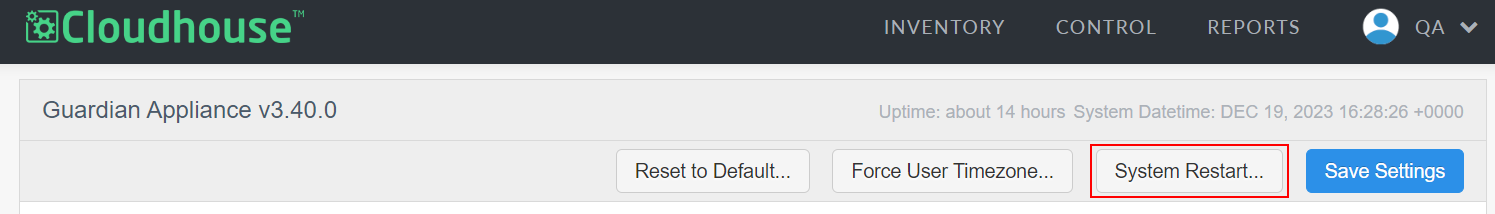 If you're experiencing issues with your Guardian instance, you can initiate a System Restart by clicking the button at the top of the Settings page.