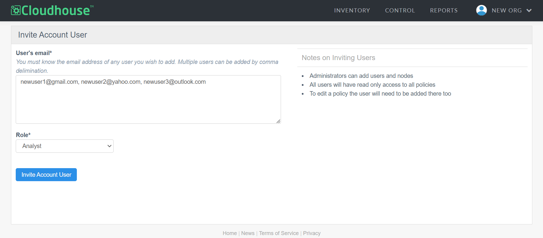 Administrators in Cloudhouse Guardian (Guardian) have the ability to invite new users to their organizations. Invites can be sent from the Users page (