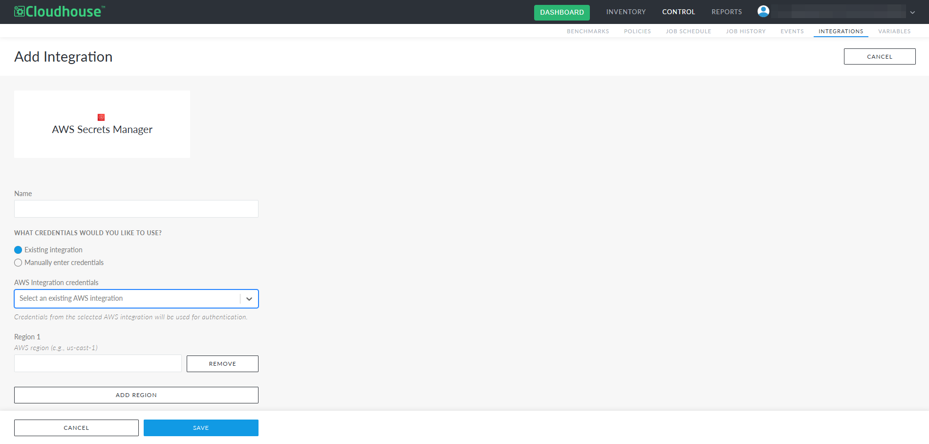 5. Select credentials from the AWS Secrets Manager drop-down list. The credentials displayed are based on values from the credentials configured in the AWS Secrets Manager integration. For more information, see AWS Secrets Manager Integration.