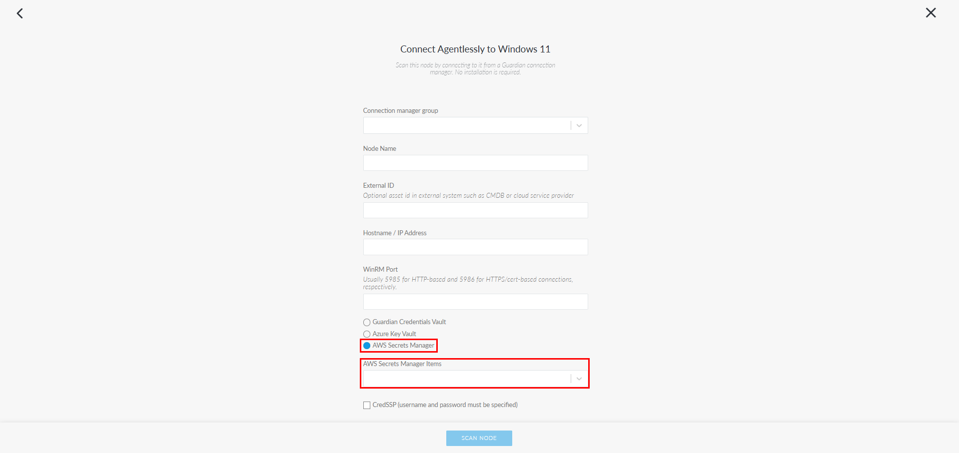 Note: The following image shows where the AWS Secrets Manager option appears when adding a Windows node.