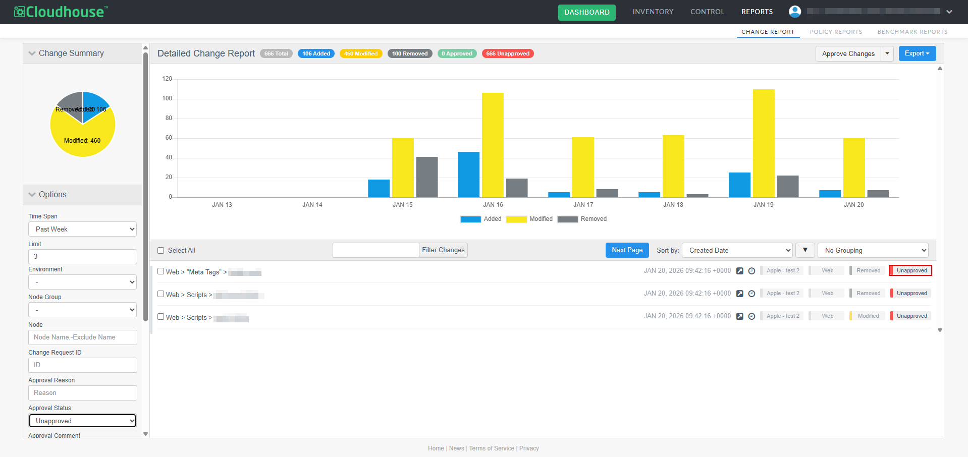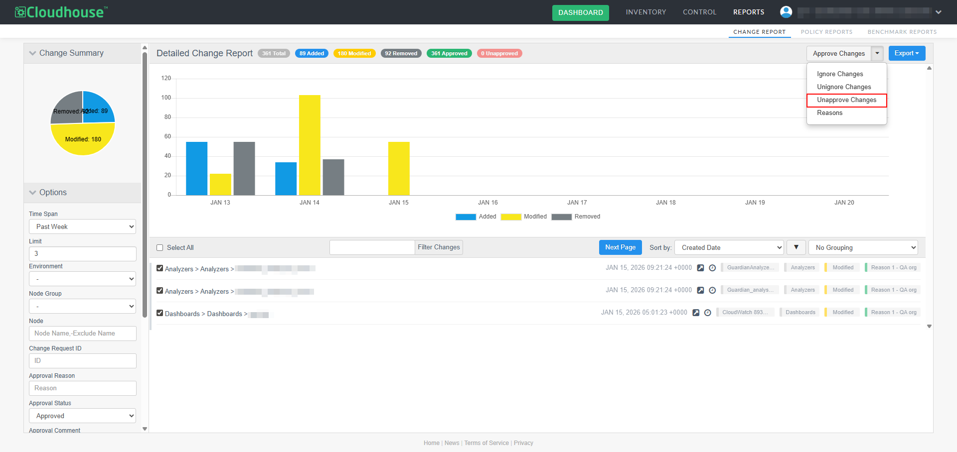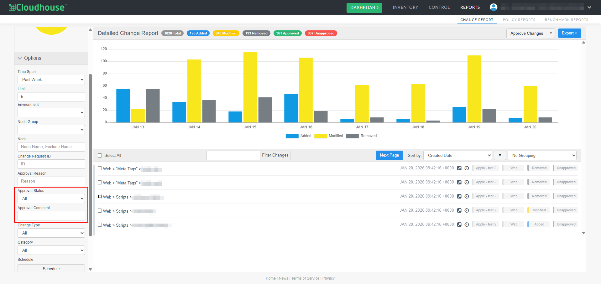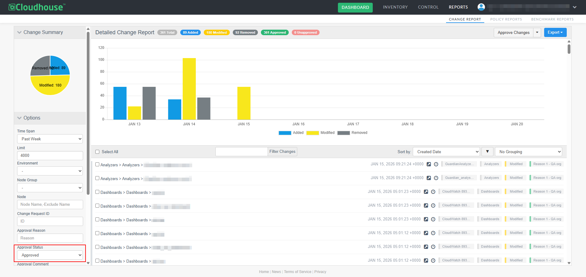 A new optional feature, Manual Change Reconciliation, has been added to the Change Report tab (Reports > Change Report) to allow for manual approval of any changes that have occurred within your Cloudhouse Guardian (Guardian) instance, giving you greater control over configuration changes. With this enhancement, you can filter changes by type, approval status, or node group, then selectively approve or unapprove them, add comments, and associate them with external change request IDs. Approved changes are tagged and can be exported in a PDF and CSV report. This allows for more deliberate change management, especially in dynamic environments where frequent updates occur. For more information on the Change Report tab's functionality, see Change Report.