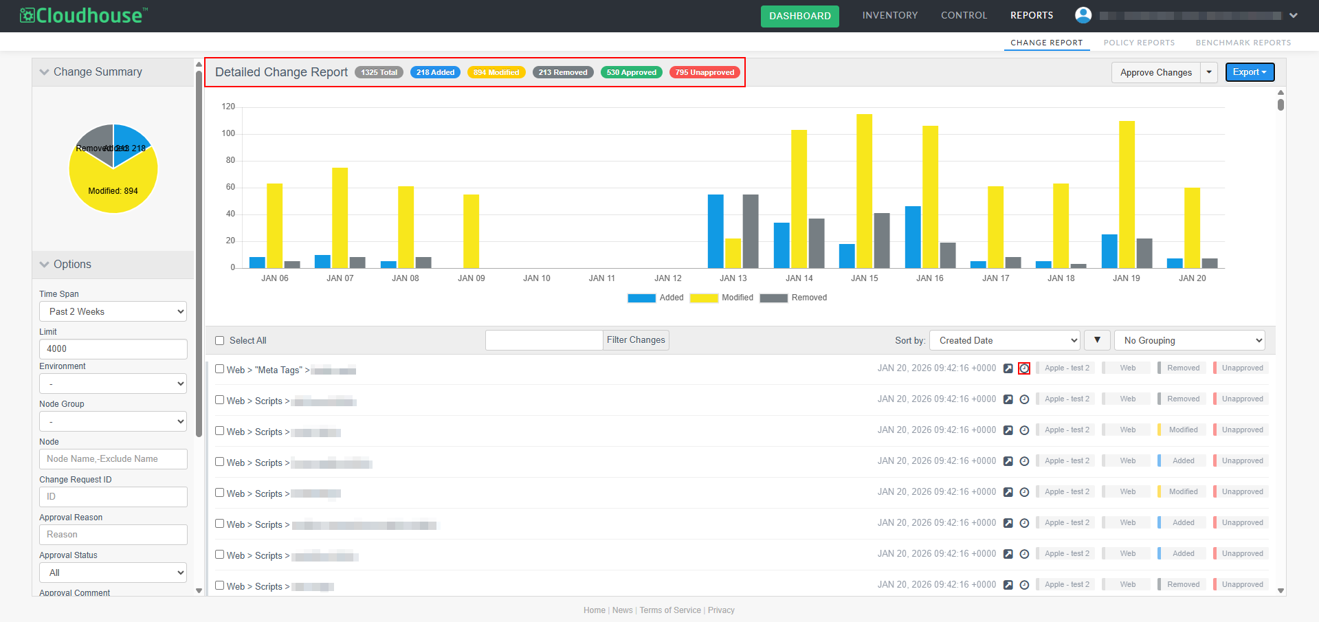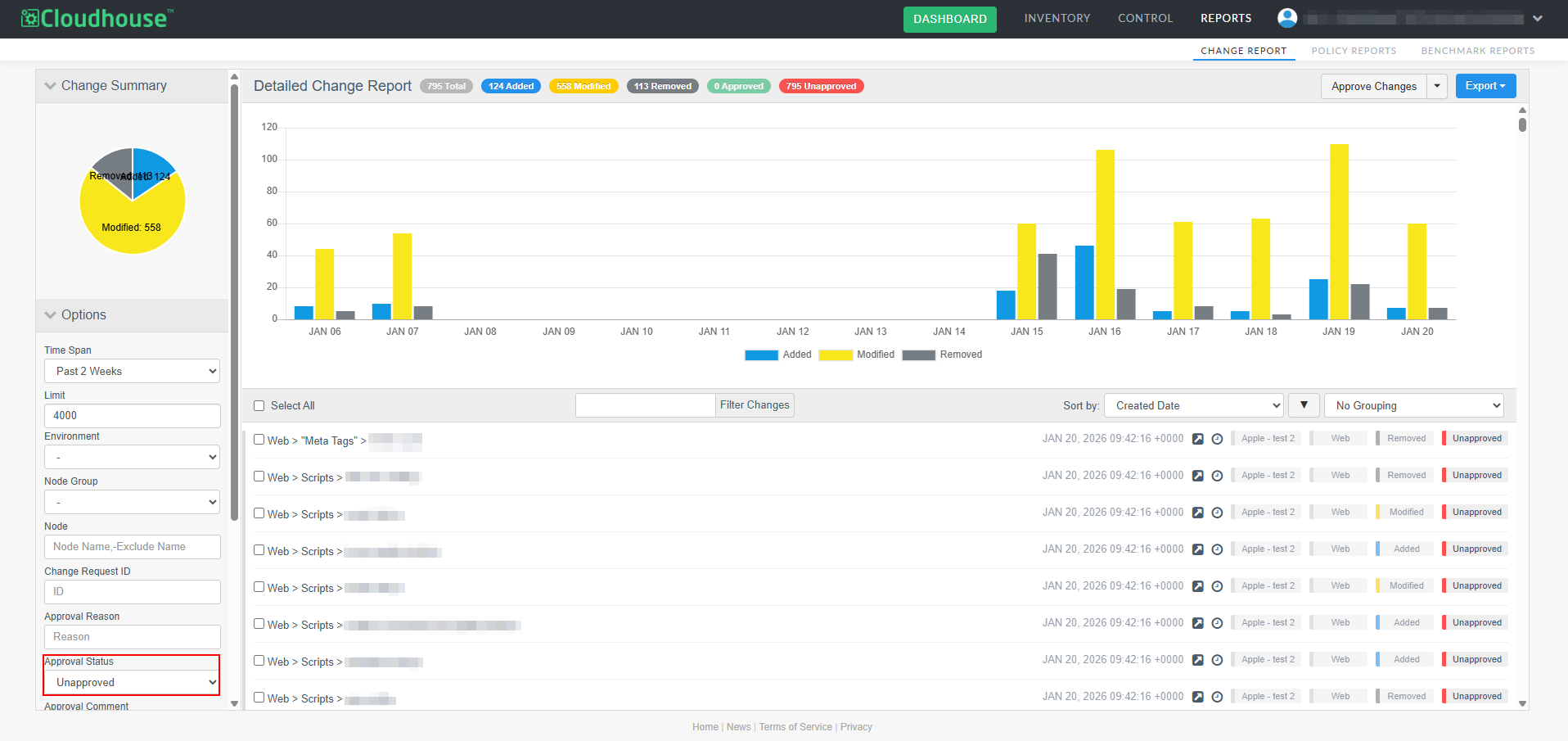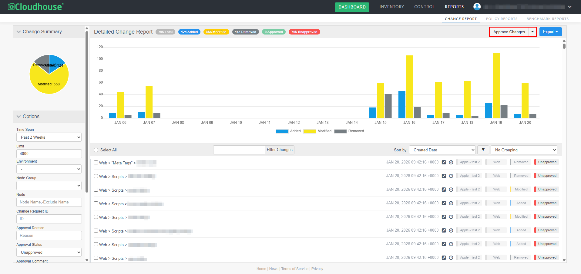 A new optional feature, Manual Change Reconciliation, has been added to the Change Report tab (Reports > Change Report) to allow for manual approval of any changes that have occurred within your Cloudhouse Guardian (Guardian) instance, giving you greater control over configuration changes. With this enhancement, you can filter changes by type, approval status, or node group, then selectively approve or unapprove them, add comments, and associate them with external change request IDs. Approved changes are tagged and can be exported in a PDF and CSV report. This allows for more deliberate change management, especially in dynamic environments where frequent updates occur. For more information on the Change Report tab's functionality, see Change Report.