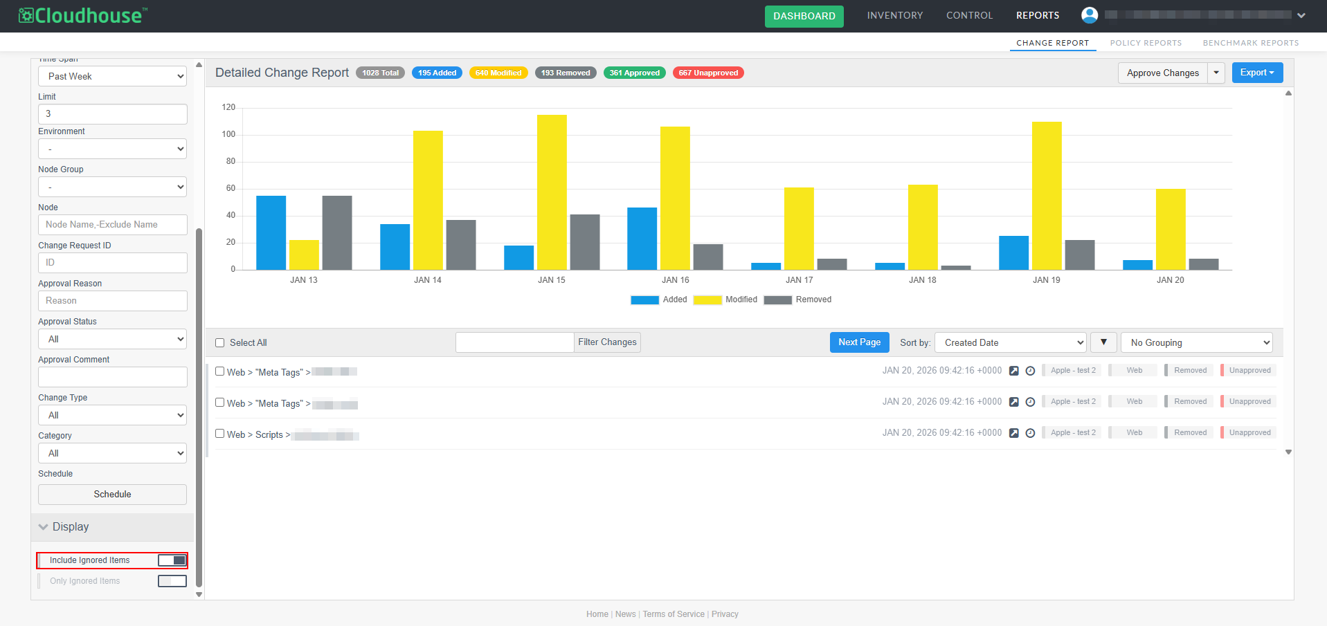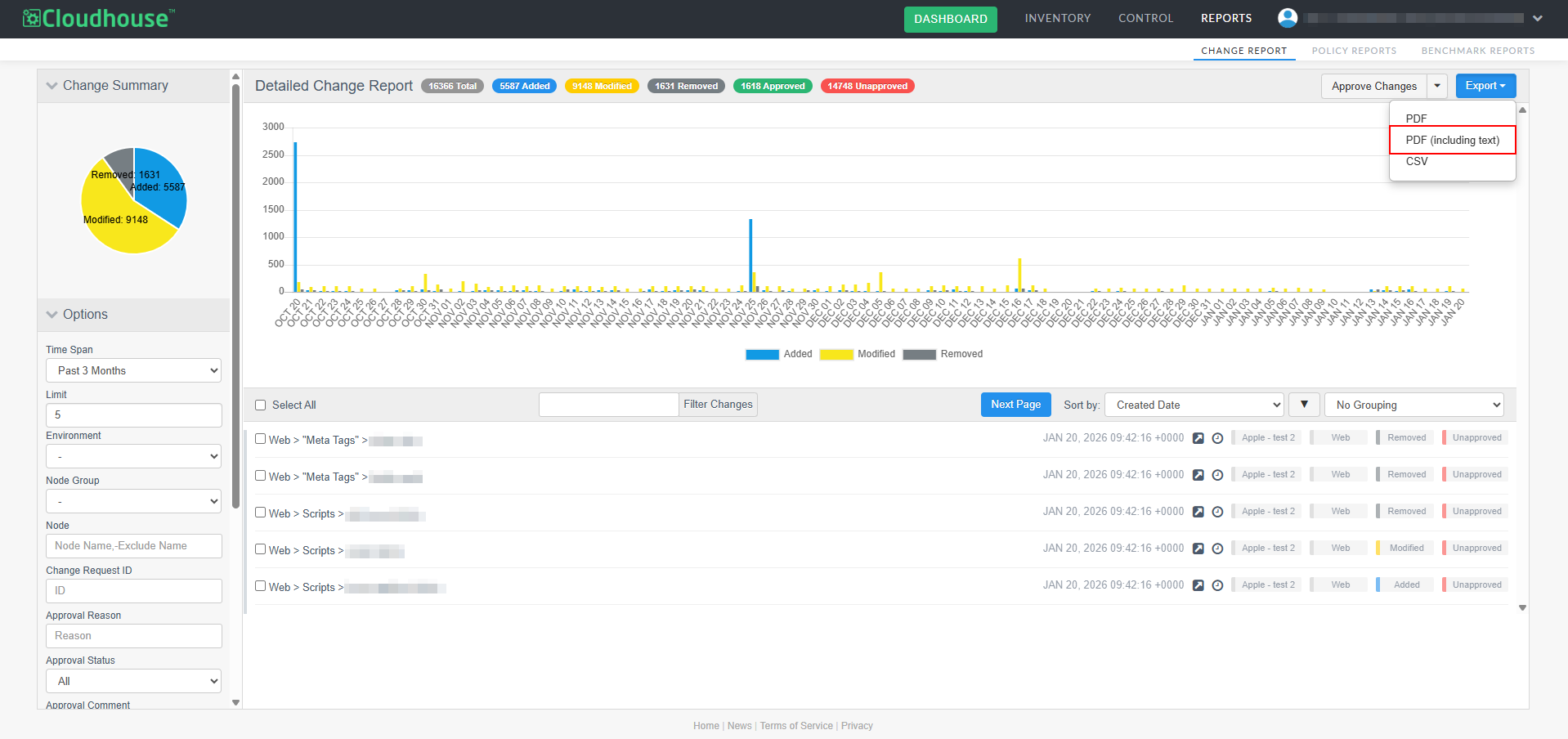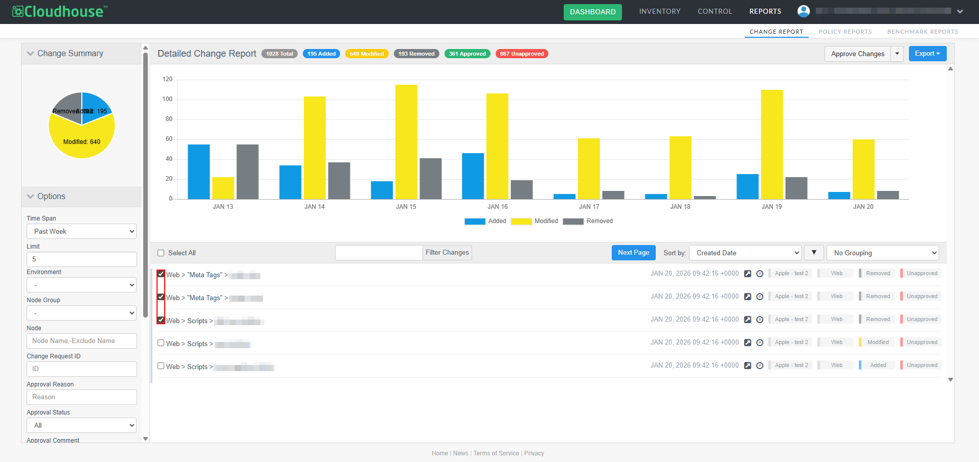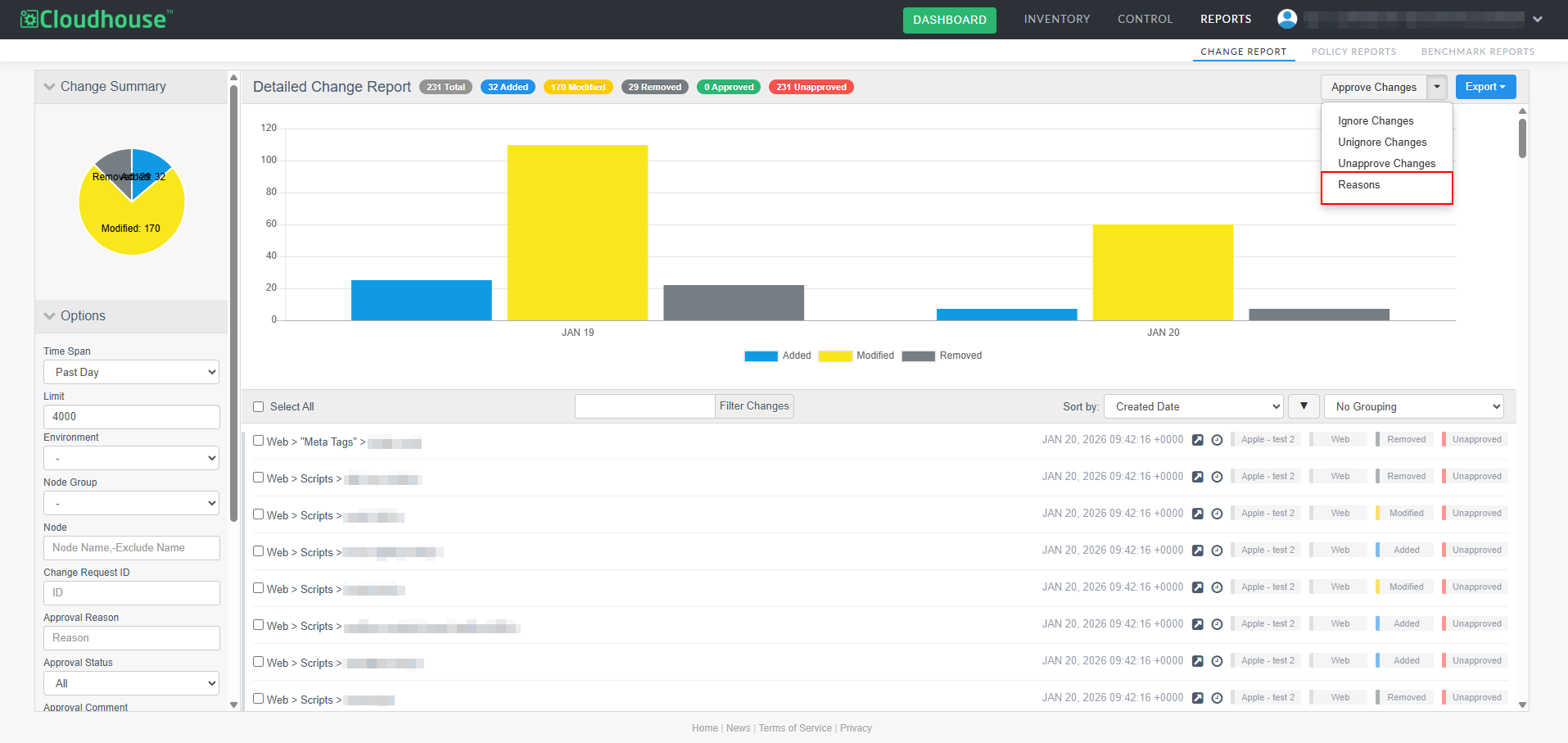 A new optional feature, Manual Change Reconciliation, has been added to the Change Report tab (Reports > Change Report) to allow for manual approval of any changes that have occurred within your Cloudhouse Guardian (Guardian) instance, giving you greater control over configuration changes. With this enhancement, you can filter changes by type, approval status, or node group, then selectively approve or unapprove them, add comments, and associate them with external change request IDs. Approved changes are tagged and can be exported in a PDF and CSV report. This allows for more deliberate change management, especially in dynamic environments where frequent updates occur. For more information on the Change Report tab's functionality, see Change Report.