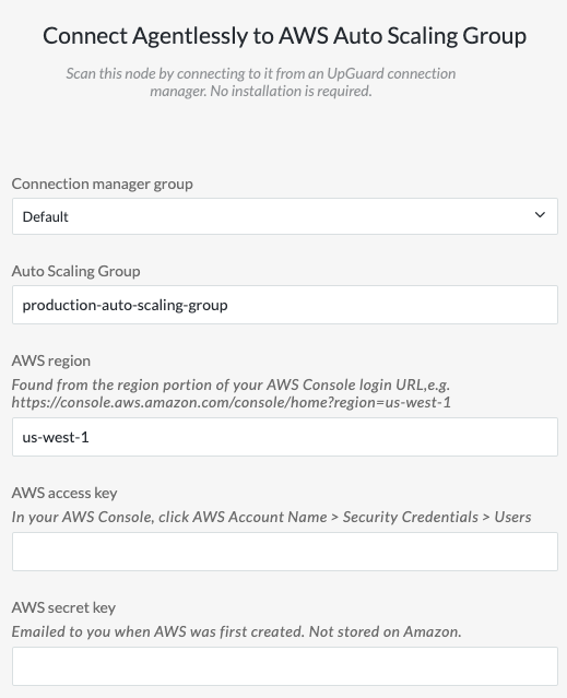 Select the Connection Manager group to use - the Default group should be fine, unless you have a custom network layout. Enter the name of the Auto Scaling Group, the region and your AWS credentials. Then click Scan Node to finish the registration process and perform an initial scan of the node. For more information on the required AWS security group permissions required to scan and sync from an Auto Scaling Group node, please see Amazon Web Services (AWS) Node.