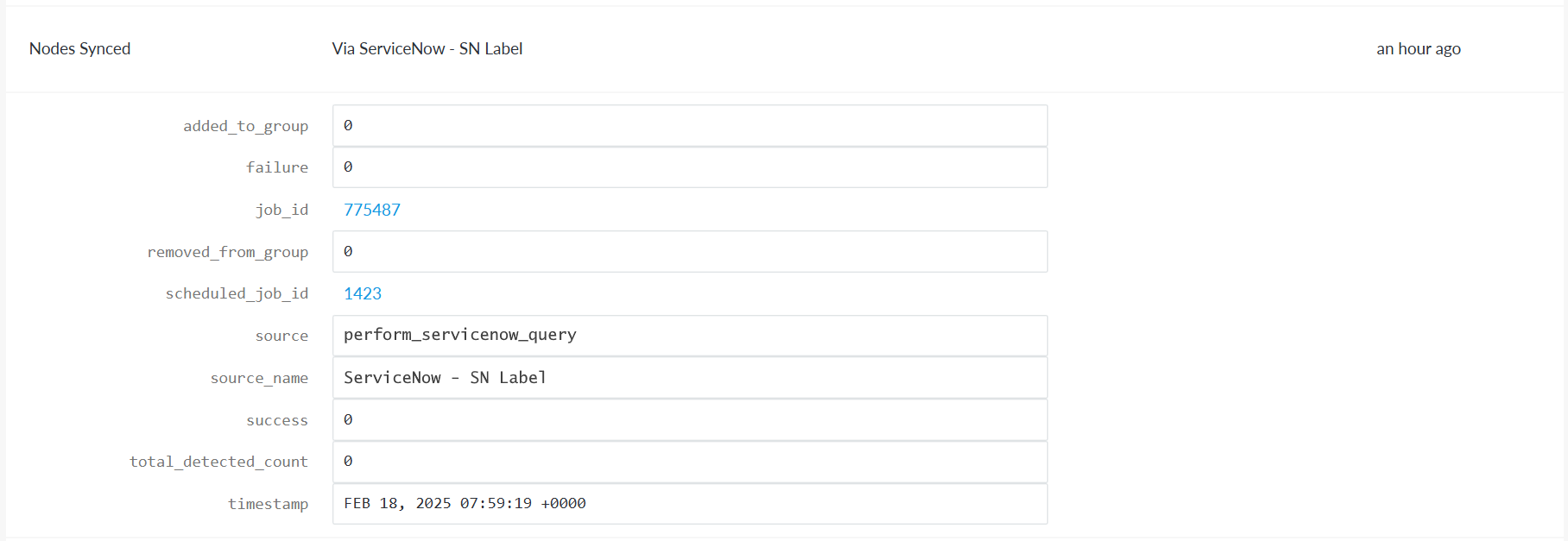 We have made various quality of life improvements to the existing ServiceNow integration with Guardian. When a ServiceNow 'Nodes Synced' event is logged in the Events tab (Control > Events), you can now click the job_id to display the Job Information page (Control > Job History) with information about each task that was run. For more information on this page, see Job Information. Additionally, you can now click the scheduled_job_id to display the internal configurations of the selected job within the Job Schedule tab (Control > Job Schedule), such as the selected integration and job run interval. For more information on this page, see Synchronize Nodes – Job Type.
