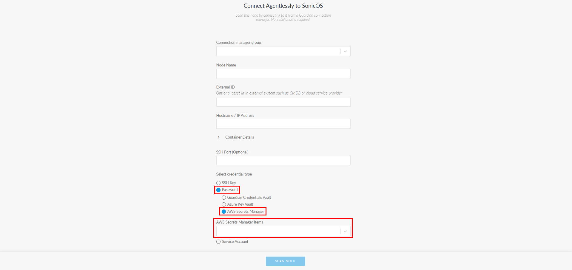 A new credential source, AWS Secrets Manager, is now available when selecting Password as the credential type when adding a Windows, Linux or Network device node from the Add Nodes tab (Inventory > Add Nodes). When selected, Guardian retrieves the username and secret directly from your organization’s AWS Secrets Manager Integration, allowing you to choose from a list of your stored credentials by selecting an option from the AWS Secrets Manager Items drop-down list. This enhancement centralizes credential storage, reduces manual entry, and adds support for secure, cloud‑hosted credential retrieval when adding nodes.