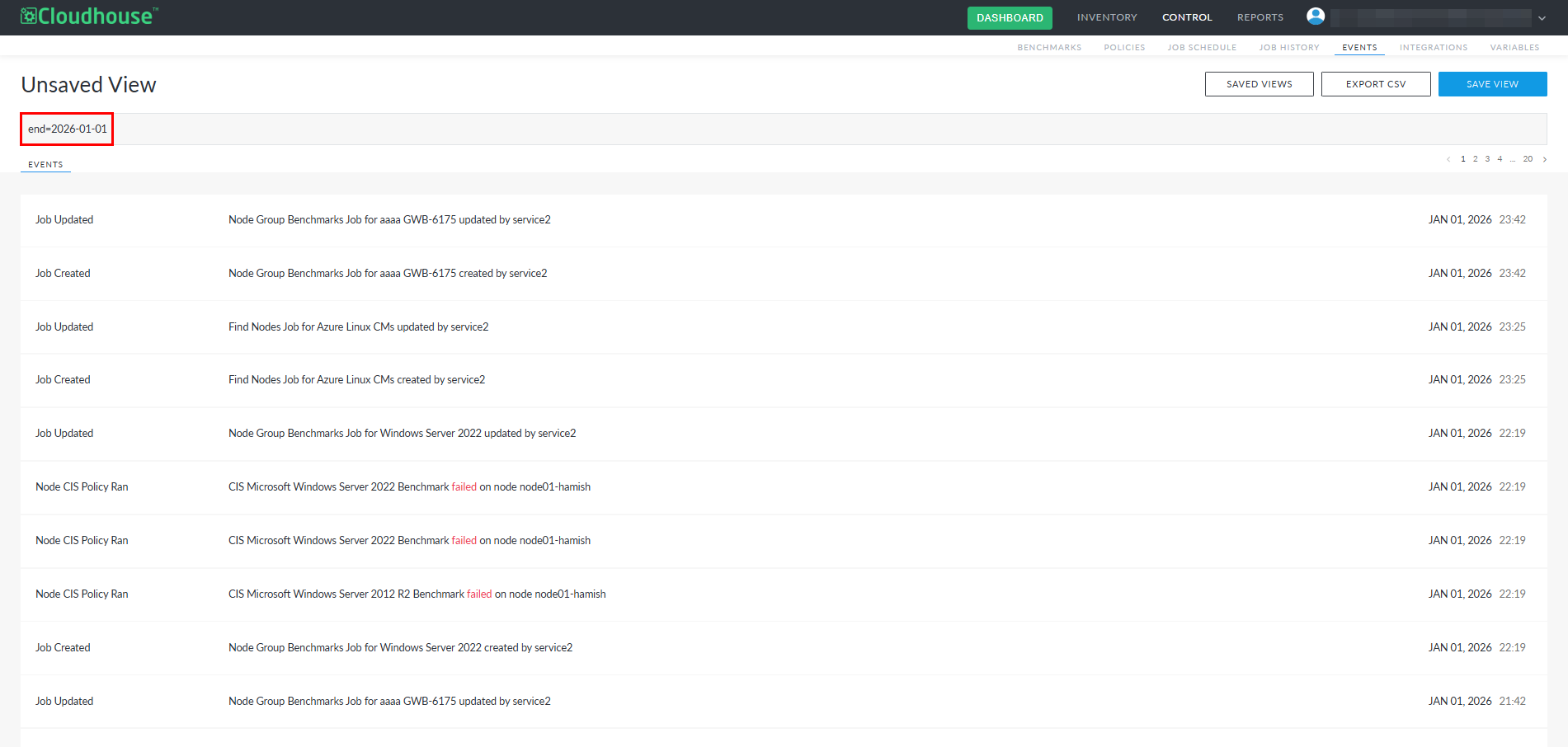 The Events tab (Control > Events) now supports a more flexible and intuitive search and export experience. Previously, event searches required the 'type=' attribute before any other parameters could be applied, often resulting in multiple searches and repeated exports. The search functionality now accepts attribute‑based queries directly, allowing parameters such as 'environment=', 'nodegroup=', 'start=', and 'end=' to be used independently or together. Exports now reflect the full set of results returned by these broader searches. This update provides a simpler and more powerful way to retrieve comprehensive event data in a single query.